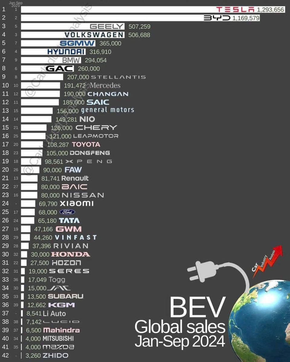 BYD đạt 1.169.579 xe thuần điện trong 9 tháng đầu năm 2024, tăng trưởng 11,6% so với cùng kỳ năm trước. Nếu tính cả xe hybrid, BYD đã vượt Tesla về tổng số lượng xe bán ra, khẳng định vị thế vững chắc trong ngành.